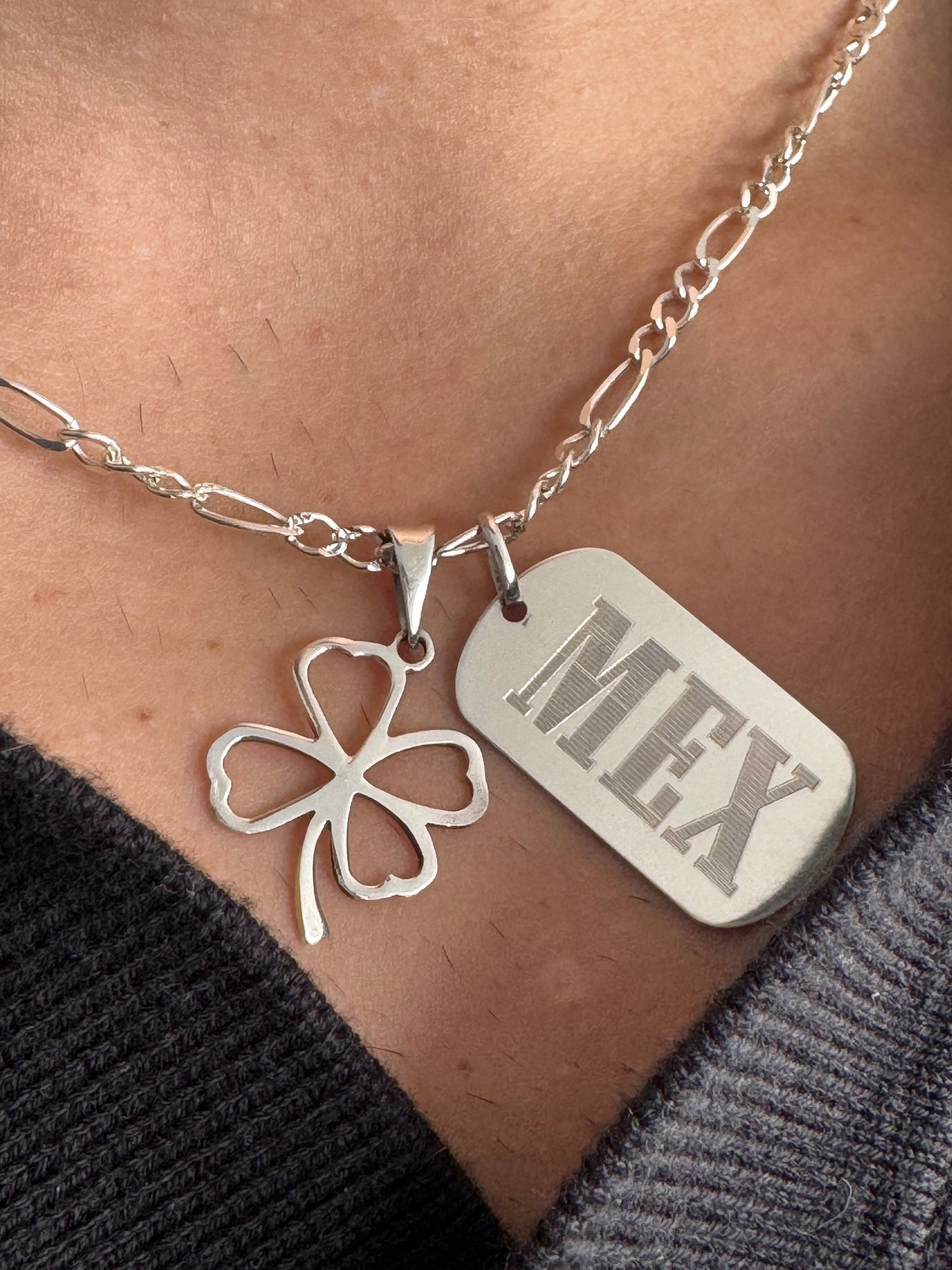 Collar de plata 925 con dijes de trébol y México en plata 925, la placa se puede personalizar (esto tarda 2 semanas en estar listo)